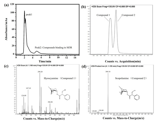 DF is the dried flower of Datura metel L. As an herbal medicine, DF has been applied to treat asthma, relieve pain, and smooth muscle spasms in traditional Chinese medicine clinical practice. Based on the pharmacological mechanism, we hypothesized that some bioactive components of DF can bind to M3R. Next, DF extracts were analyzed by the M3R-immobilized chromatographic column. Indeed, certain compounds did bind to the M3R-immobilized column. Two intense peaks of the chromatogram were observed (Figure 8a). Concerning two of the peaks, peak one was deemed a general mixture without any specific affinity to the immobilized M3R because the retention time was close to the void time of the column. Peak two had a longer retention time than the void time, indicating that the mixture coupled to M3R was coeluted. The following HPLC-Q-TOF-MS assay suggested that the eluted mixture was composed of two components, with the highest intensities at 290.20 ([M+H]+) and 304.10 ([M+H]+) corresponding to molecular weights of 289.20 and 303.10, respectively (Figure 8b–d). The daughter ions of these two ions (m/z) were 167.10 ([M–C8H14N]+) and 124.00 ([M–C9H8O3]+) as well as 156.00 ([M–C9H8O2]+) and 138.00 ([M–C9H8O2-OH]+). These compounds were verified as hyoscyamine and scopolamine [26,27].