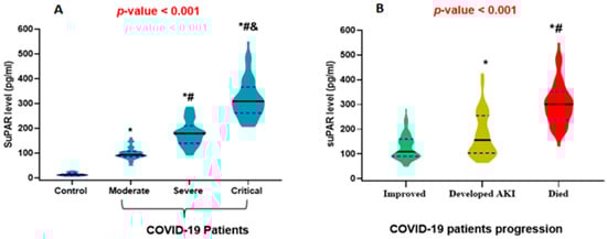 Violin plot demonstrating the median levels of the soluble urokinase plasminogen activator receptor (suPAR): (A) COVID-19 patients group compared to control. (B) Prognosis of COVID-19. Black lines: indicate the median and blue dots indicate the 25% and 75% quartile. (Panel A): * significant compared to control, # significant compared to moderate COVID-19, and & significant compared to severe COVID-19. (Panel B): * significant compared to improved cases, # significant compared to those who developed AKI and are still alive. One-way ANOVA and post hoc Bonferroni were used to calculate the p-value. Significance was set at p < 0.05.