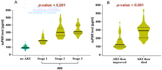 Violin plot for the median level of the soluble urokinase plasminogen activator receptor (suPAR) in COVID-19 patients according to (A) AKI stages and (B) prognosis of AKI. Black lines: indicate the median and blue dots indicate the 25% and 75% quartile. One-way ANOVA and unpaired t-test were used to calculate the p-value. Significance was set at p < 0.05.