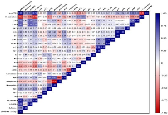 Correlation matrix showing the interrelationship between suPAR level and the different study variables. The blue color indicates a positive correlation, and the red color indicates a negative correlation. The value of r indicates the degree of association. Significance was set at p < 0.05.