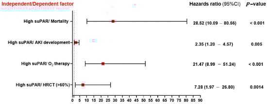 Figure 4 shows that patients with a higher median suPAR value were 28.52 times more likely to die from COVID-19 infection progression. They were also 21.47 times more likely to require O2 therapy in the form of high oxygen flow, CAPA, or intubation, 7.28 times more likely to have >60% condensations in their chest CT, and 2.35 times more likely to acquire AKI after COVID-19 infection.