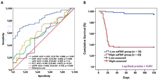 ROC analysis showed that the serum suPAR level at a cut-off value of 117.8 pg/mL had a sensitivity of 83.2% and specificity of 53.7%, and the area under the curve (AUC) = 0.821 with a significance of <0.001, compared to the eGFR that had a sensitivity of 74.7% and specificity of 42.6% and the area under the curve (AUC) = 0.642 with a significance of 0.004. The CRP showed a sensitivity of 63.2.7% and specificity of 46.3%, and the area under the curve (AUC) = 0.591 with a p-value of 0.066, while the LDH and PLT showed insignificant AUCs that were 0.500 and 0.560, respectively (Figure 5a). For survival analysis, patients were divided into two groups, high versus low suPAR, based on median suPAR cut-off values. Interestingly, Kaplan–Meier curve analysis showed significantly impaired long-term survival for patients with high suPAR levels compared to patients with lower suPAR levels. The median overall survival (OS) was only 21 days for patients with high suPAR levels versus 120 days for low suPAR levels (Figure 5b).