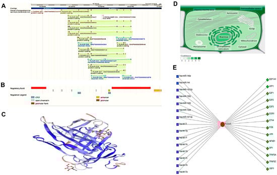 The plasminogen activator, urokinase receptor (PLAUR) structural and functional analysis. (A) The chromosomal location and the related transcripts. The blue color is non-coding, while the others are coding transcripts; (B) the sites of the promoter and enhancer regulatory factors, either Cis or trans; (C) the predicted 3D structure of the PLAUR generated through SWISS modelling; (D) the localization of the PLAUR. The color degree is related to protein abundance subcellular, and (E) the transcriptional factor (TF)-miRNA coregulatory interactions include 14 TF (green diamonds) interacting with the specified protein and 15 microRNAs (blue squares).