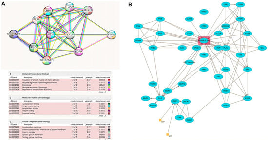 PLAUR pathway analysis: (A) The protein–protein interactions network with the top biological processes, molecular functions, and pathways created by the “STRING database”. Each interacting node with the hub PLAUR represents the top 10 predicted functional protein partners with a high confidence level. (B) Reactome database fibrinolysis pathway was modified to show how an infection could affect the fibrinolysis process.