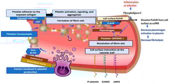 The inactive zymogen plasminogen must be changed into an active plasmin, which then breaks down cross-linked clots to begin fibrinolysis. The two plasminogen activators: (1) tissue plasminogen activator (tPA) and (2) urokinase plasminogen activator (uPA), are primarily responsible for the liver’s production of plasminogen, which is then converted to plasmin []. While uPA can act in open circulation, interaction with the urokinase-type plasminogen activator receptor significantly increases its enzymatic efficiency (uPAR, also called CD87) [].
