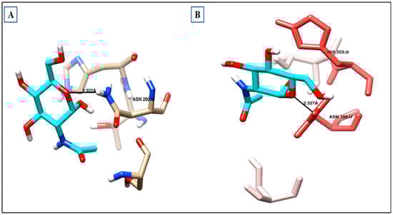 As shown in (Table 6) and (Figure 9a), the co-crystallized ligand NDG creates one hydrogen bond within the binding site pocket of 2FD6 protein through its carbonyl group. There is a hydrogen bond acceptor with the hydrogen of Asparagine200, whose bond length is 2.327 Å (Figure 9b). It does not form lipophilic interactions inside the receptor binding site, but it forms other types of interaction, such as dipole–dipole interaction with Histidine 203 amino acid residue.