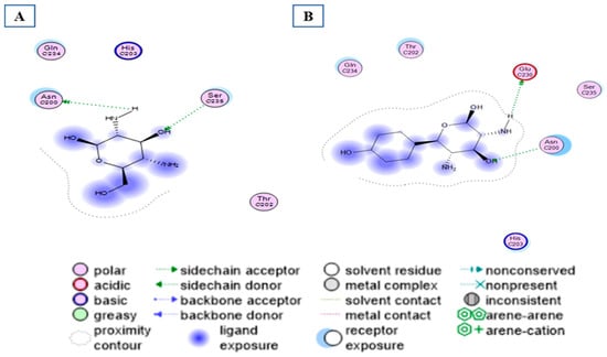Ligand–receptor interactions: (A) binding disposition and (B) lipophilic interactions of NDG inside the 2FD6 binding site; red-colored amino acids are the hydrophilic amino acids.