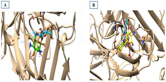 Superimposed models of the docked output to test the most suitable two compounds inside the binding sites of 2FD6. (A) The green one is compound 3, the co-crystallized ligand is cyan-colored, and (B) the yellow one is compound 4 superimposed with the cyan-colored co-crystallized ligand.