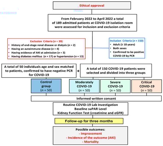 Adult patients (≥18 years) of both sexes who were hospitalized primarily for COVID-19 after being confirmed to be positive via reverse transcriptase-polymerase chain reaction (RT-PCR) assay of an oropharyngeal or nasopharyngeal swab were included. Patients with a prior history of end-stage renal disease (ESRD) or on dialysis, had an autoimmune disease, or had evidence of renal impairment or AKI as a first presenting complaint at admission, had diabetes mellitus, or hypertension were excluded. The patient cohort was divided into three groups (moderate, severe, and critically ill; each = 50). The control group (n = 50) matched the patients in age and sex and were confirmed to have negative PCR for COVID-19.