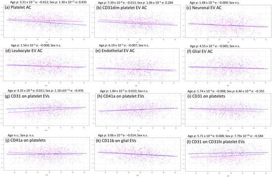 Most relevant age–sex tendencies of EVs and platelets. Each scatter plot represented males in blue and females in pink, age in the x axis, and normalized trait in the y axis.