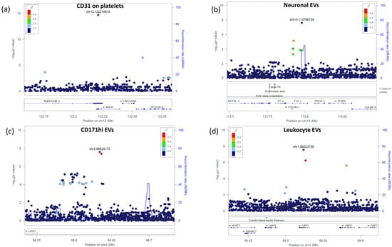 The other three novel genetic signals included an association of neuronal EVs with the F10 gene, consistent with the suggested involvement of coagulation factors, such as F10, in neurodegeneration [,,]. A second signal linked CD171hi EVs, which are mainly derived from the nervous system, with LRIG1 and KBTBD8, both genes involved in neuronal development and differentiation []. The last signal associated leukocyte EVs, known to induce immune and inflammatory responses [], with GBP1, a gene involved in the inflammatory response. All of these genes are correspondingly implicated in the function of the EV subsets with which they are associated.