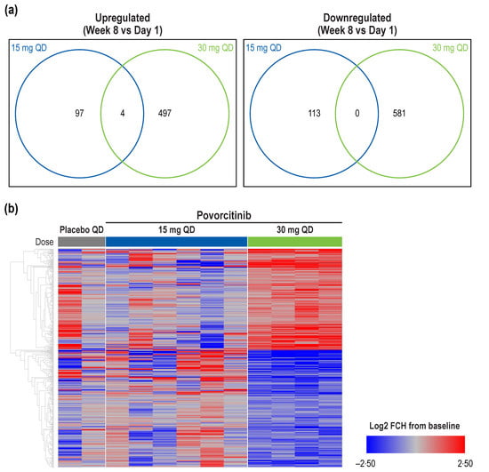 Lesional skin punch biopsies from 12 sample pairs taken from the edge of an active HS lesion []; both baseline (Day 1) and Week 8 data (15 mg povorcitinib once daily [QD], n = 6; 30 mg povorcitinib QD, n = 4; placebo QD, n = 2) were available for analysis. In RNA-seq analysis of HS lesional skin, there was minimal overlap between the 15 and 30 mg povorcitinib QD groups in DEGs from Week 8 versus baseline (Figure 1a). Consistent with its characterization in the efficacy studies as a potential minimum effective clinical dose [], the 15 mg povorcitinib QD group had a notably reduced effect on gene expression compared with the 30 mg QD group, as indicated by the lower number of significant DEGs. A total of 1082 DEGs between Week 8 and baseline were identified in samples from the 30 mg povorcitinib QD group (Figure 1a,b). Of these, 501 DEGs were induced and 581 DEGs were repressed. Consistent with clinical response data, placebo and 15 mg povorcitinib QD showed a similar transcriptomic pattern to each other (Figure 1b) [].