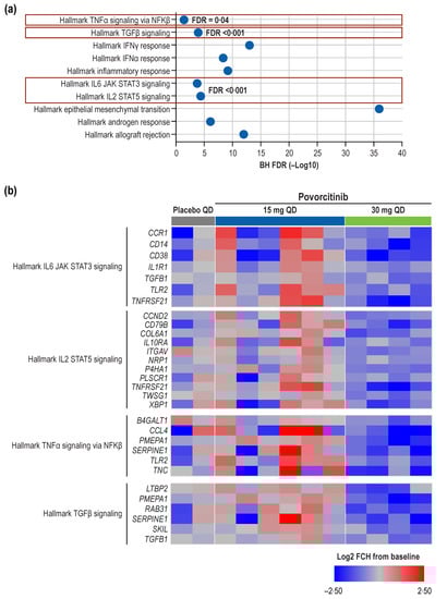 Pathway enrichment analysis. (a) Pathway enrichment analysis at Week 8 of treatment with 30 mg povorcitinib QD and (b) heatmap of Week 8 DEGs from selected Hallmark signaling pathways. DEG, differentially expressed gene; FCH, fold change; FDR, false discovery rate; QD, once daily. Log2 FCH from baseline is used. HALLMARK signaling pathways were from the Molecular Signatures Database (MSigDB v7·2 []).