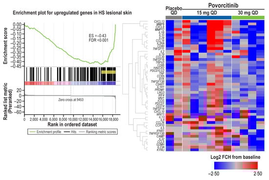 GSEA and enrichment plot showing signature reversal of upregulated genes in HS lesional skin after 8 weeks of treatment with 30 mg povorcitinib QD. * ES, enrichment score; FCH, fold change; FDR, false discovery rate; GSEA, gene set enrichment analysis; HS, hidradenitis suppurativa; QD, once daily. * Plot represents a case (30 mg povorcitinib QD treatment) and GSEA data based on previously described HS gene signature (HS-high) []. Genes displayed in heatmap are marked in yellow in the corresponding GSEA plot.