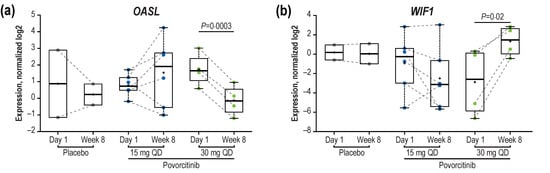 Treatment-related changes with 30 mg povorcitinib QD were also assessed on two previously published gene sets from HS lesional (vs non-lesional) and wounded (vs non-wounded) skin. The overlap of DEGs in HS lesions with genes expressed during wound healing was previously reported []. Using the same data set from the previous study, the gene signatures used for GSEA in the present analysis consisted of 1131 upregulated and 516 downregulated genes in HS lesional and wounded skin (Figure S1). Full lists of genes shared by HS lesional and wounded skin and reversed by treatment with 30 mg povorcitinib QD are shown in Supplementary Tables S1 and S2. At Week 8, a reversal of genes upregulated in HS lesions and wounded skin was observed after treatment with 30 mg povorcitinib QD (Figure S2a), including downregulation of many interferon (IFN)-stimulated genes, IL-6/STAT3 targets (CCR1, CD14/38, IL1R1, TGFB1, TLR2, and TNFRSF21) [], genes with innate inflammatory and antiviral functions (e.g., PARP14, ISG20, OAS2, and OASL; Figure 4a), and genes with antimicrobial properties (e.g., TDO2 and DEFB103B; Table S1). Conversely, genes lowly expressed in HS lesional and wounded skin were upregulated after 30 mg povorcitinib QD treatment (Figure S2b), including genes involved in sweat gland development such as WIF1 (Figure 4b), KRT77, and KRT31 (Table S2). Finally, FOXA1, a transcription factor required for sweat secretion, previously shown to be downregulated in HS lesional skin and upregulated in wound-healing skin, was significantly upregulated following 8 weeks of treatment with 30 mg povorcitinib QD.