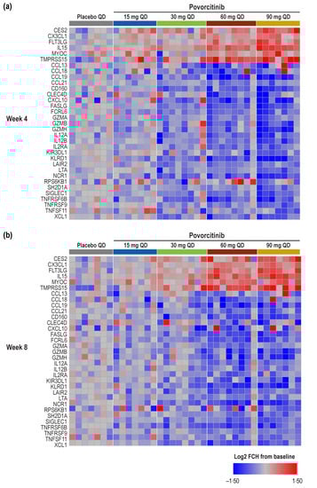 Serum was collected from all participants at baseline and Weeks 4 and 8 for proteomic analysis. Availability of skin biopsy samples for transcriptomic analysis was limited to 12 sample pairs (15 mg povorcitinib once daily [QD], n = 6; 30 mg povorcitinib QD, n = 4; placebo QD, n = 2).