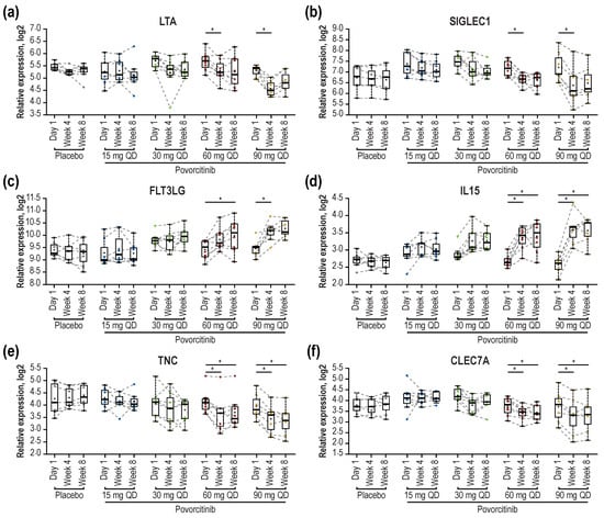 Based on paired comparisons and the significance cutoff, a total of 33 differentially expressed proteins (DEPs) of interest were selected (6 upregulated and 27 downregulated proteins), representing the union of statistically significant upregulated and downregulated proteins for each treatment at Weeks 4 and 8 (FDR < 0.05 and absolute fold change [|FCH|] > 1.5). Modulation of these DEPs appeared to be dose dependent both at Week 4 (Figure 5a) and Week 8 (Figure 5b) and suggested a rapid onset of response, as these changes were generally observed as early as Week 4 and maintained over time. As has been previously reported [], IL2RA was significantly reduced by Week 4 following treatment with 60 and 90 mg povorcitinib QD, with milder reductions observed in sera from patients treated with 15- or 30-mg doses. Furthermore, protein levels of lymphotoxin-alpha (LTA) and sialic acid-binding Ig-like lectin 1 (SIGLEC1) were significantly reduced by Week 4 following treatment with 60 and 90 mg povorcitinib QD, with milder reductions observed with 15- or 30-mg doses (Figure 6a,b). Conversely, levels of Fms-related receptor tyrosine kinase 3 ligand (FLT3LG; Figure 6c) and IL15 (Figure 6d) were increased after treatment with 60 and 90 mg povorcitinib QD. In addition to the DEPs identified above, tenascin C (TNC) and C-type lectin domain containing 7A (CLEC7A), previously shown to be upregulated in HS versus healthy controls [], missed the analysis cutoff for DEP (|FCH| > 1.5 and FDR < 0.05) but were both significantly reduced based on FDR alone by Week 4 following treatment with 60 and 90 mg povorcitinib QD (Figure 6e,f). Other proteins that were differentially expressed in response to povorcitinib included CCL18, CLEC4D, GZMB, LAIR2, SH2D1A, and TNFRSF6B (Figure 5), whose corresponding genes were previously shown to be highly expressed in HS lesional (vs. non-lesional) and wounded (vs. non-wounded) skin []. Finally, treatment with povorcitinib led to the differential expression of CXCL10, GZMH, IL12B, IL2RA, and TNFSF11, whose corresponding genes were previously shown to be highly expressed in lesional skin from patients with HS compared with healthy controls [].