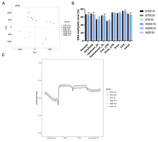 DNA methylome profiles of STE and WZE. (A) PCA of CG methylation patterns of STE and WZE during E15−P1. (B) CG methylation levels of both breeds in each stage in genome, gene body, upstream 2 kb, downstream 2 kb, 5′−UTR, 3′−UTR, exon, coding sequence, and intron regions of STE and WZE during E15−P1. (C) Average CG methylation level of all the libraries in upstream 2 kb, exon, intron, and downstream 2 kb regions of STE and WZE during E15−P1. * p < 0.05; ** p < 0.01.