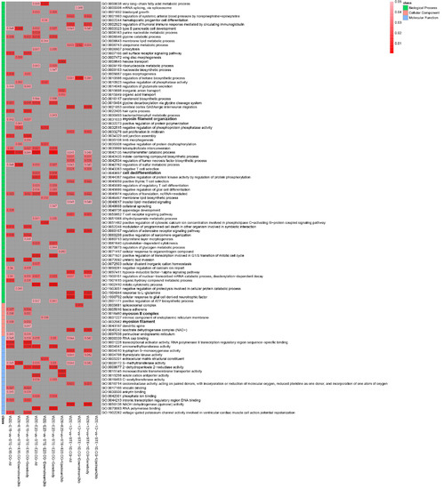 To understand the biological functions of methylation-related DEGs, GO analysis was conducted on all 104 DEGs between the two goose breeds at the same stage. Four significantly enriched myogenesis-related GO terms were identified in the biological process category: myosin filament organization, cell differentiation, myosin II complex, and myosin filament (Figure 5). Among these biological processes, myosin filament organization was significantly enriched in WZE E15 vs. STE E15 (CG, all gene, and gene body), WZE E23 vs. STE E23 (CG, all gene, and gene body); cell differentiation was significantly enriched in WZE E23 vs. STE E23 (CG, all gene, and gene body); myosin II complex was significantly enriched in WZE E23 vs. STE E23 (CG, all gene, and downstream 2 kb); and myosin filament was significantly enriched in WZE E15 vs. STE E15 (CG, all gene, and gene body). These findings indicate that DNA methylation had a more distinct impact on gene regulation during E15–E23 between two goose breeds. Several genes involved in the abovementioned myogenesis-related biological processes were identified, such as Obscn, Myo5B, NRAP, Myh1B, and KIF24 (Table S3). These genes may be affected by different DNA methylation patterns to regulate embryonic leg muscle development in the two goose breeds.