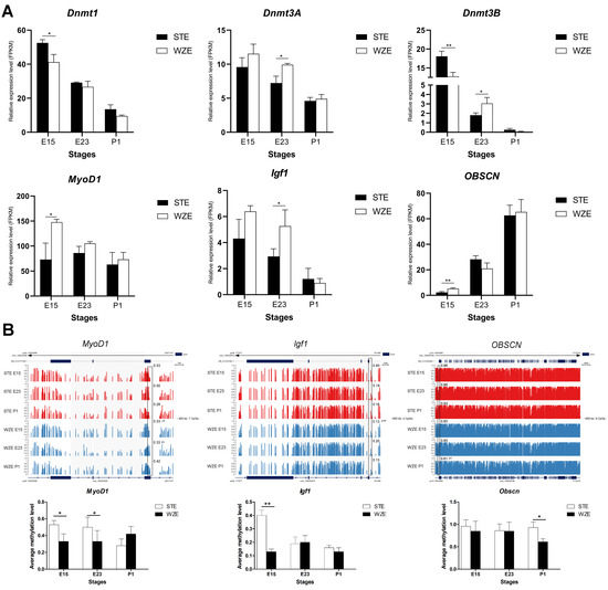 All DNA methylases/demethylases showed decreased expression during E15–P1. Among the three methylase-encoding genes, Dnmt1 and Dnmt3B showed significantly higher expression in STE than in WZE at E15, while Dnmt3A and Dnmt3B showed significantly higher expression in WZE than in STE at E23. Among the three demethylase-encoding genes, Tet1 showed significantly higher expression in WZE than in STE at E15, while Tet2 and Tet3 showed significantly higher expression in WZE than in STE at E23. At P1, Tet2 showed significantly higher expression in STE than in WZE. Among myogenic genes, MyoD1 and Obscn showed significantly higher expression in WZE than in STE at E15, while Igf1 showed significantly higher expression in WZE than in STE at E23 (Figure 6A and Figure S2).