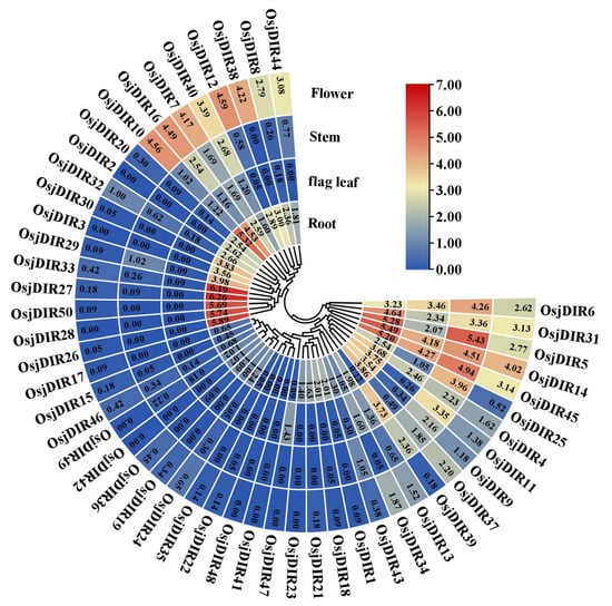 2.4. Bioinformatics Analysis of the Expression Patterns of OsjDIR Genes