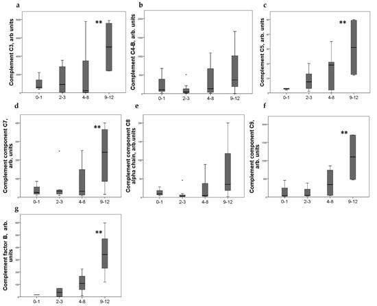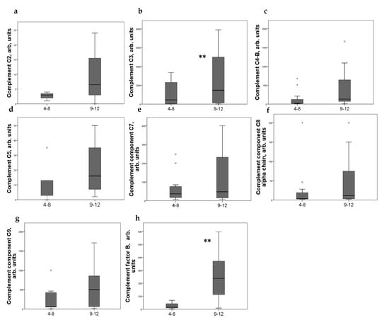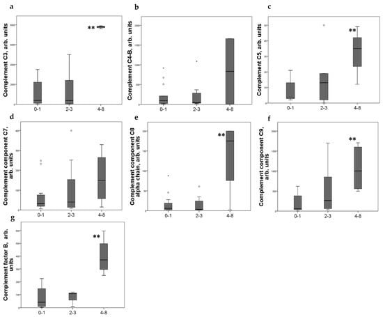 Components of complement in urine (a) C3; (b) C4-b; (c) C5; (d) C7; (e) C8alfa chain; (f) C9; (g) factor B of patients with different CD44+ PEC expression score. Boxplots above present the results of Kruskal–Wallis test of parameters for independent samples with different CD44+ expression score. Center line indicates median, top of box indicates the 75th percentile, bottom of box indicates the 25th percentile, whiskers indicate the 10th and 90th percentiles, asterisk indicates extreme values (more than 3 interquartile ranges), and circles indicate outliers (between 1.5 and 3 interquartile ranges). ** p < 0.05.