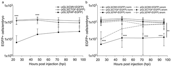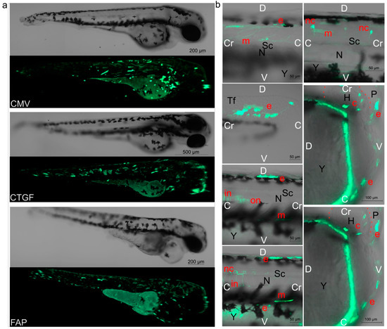 Selina, P.I.; Alekseenko, I.V.; Kurtova, A.I.; Pleshkan, V.V.; Voronezhskaya, E.E.; Demidyuk, I.V.; Kostrov, S.V. Efficiency of Promoters of Human Genes FAP and CTGF at Organism Level in a Danio rerio Model. Int. J. Mol. Sci. 2023, 24, 7192. https://doi.org/10.3390/ijms24087192