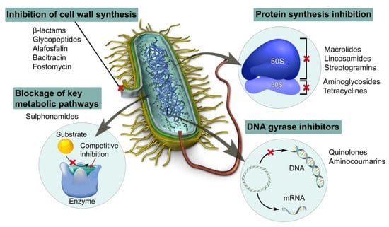 Possible mechanisms of bacterial activity disruption caused by antibiotics (scheme prepared based on the information presented in [,]).