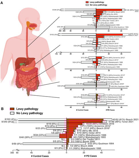 ENS Lewy pathology detected in postmortem studies of confirmed PD cases. (A,B) Each row represents one study, with the citation indicated. PD cases are to the right of the y-axis, while control cases are to the left of the y-axis. For each patient group, the number of cases with Lewy pathology (red) out of the total number of cases examined in that group is given next to the corresponding bar, with % positive for Lewy pathology given in parentheses. Only cases unique to each study are included. In (A), graphs (from top to bottom) represent studies of the esophagus, stomach, small intestine, large intestine, and rectum. In (B), for each study, the total number of PD or control cases with Lewy pathology detected in any gastrointestinal segment is shown. * Indicates an unknown number of subjects from these studies are overlapping. N.I., Not included in the study. N.S., Not shown in the study. Figure created using Biorender.com and GraphPad Prism 9. Refs. [,,,,,,,,,,,,,].