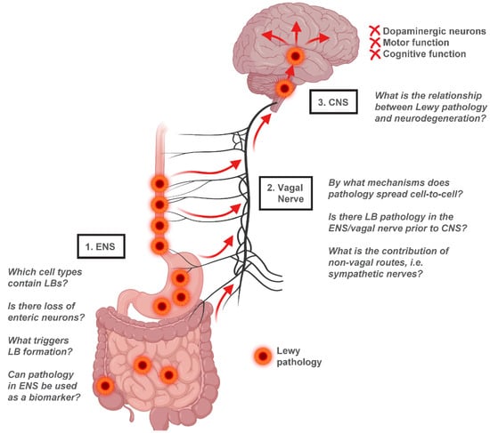 Gut-to-brain α-synuclein transmission hypothesis of PD. Evidence from human studies suggests that Lewy pathology in the ENS of PD patients is concentrated in the upper gastrointestinal tract, with the greatest LB density found in the esophagus and stomach. This distribution parallels vagal innervation of the ENS, consistent with a potential transmission of α-synuclein from the ENS retrogradely through the vagal nerve into the CNS. Once in the CNS, Lewy pathology appears to spread from the brainstem to the midbrain and finally to cortical regions, resulting in neurodegeneration and functional decline. Several unresolved questions relating to the gut-to-brain hypothesis of PD are highlighted. Figure created using Biorender.com.