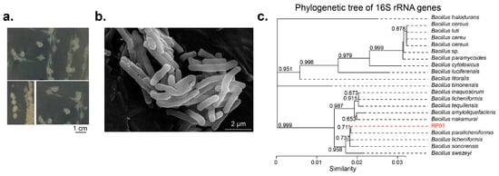 According to the method of Shen et al. [], P-solubilizing Pikovskaya (PKO) agar medium was used to isolate RP01 from the root surface of Brassica chinensis L. grown in the Beibei District (30°26′12″ N, 106°26′25″ E), Chongqing, China. Bacterial suspensions were prepared by culturing cells in 50 mL of LB medium (10 g/L of tryptone, 5 g/L of yeast extract and 10 g/L of NaCl) in 300 mL flasks on a rotary shaker (150 rpm) at 37 °C for 12 h. Scanning electron microscopy was used for morphological observations []. The phenotypical, physiological and biochemical characteristics of RP01 were determined using the methods described by Samina et al. []. These characteristics included gelatin liquefaction, glucose-produced acid and gas, xylose-produced acid, the methyl red test, the presence of catalase and oxidase, phenylalaninase, starch hydrolysis, the use of citrate, and the Voges–Proskauer test (Supplementary Table S2).