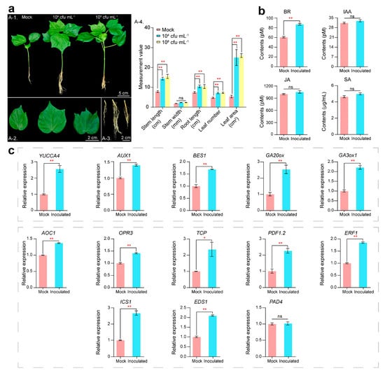 Phenotypic changes in cotton 30 days after inoculation with B. paralicheniformis RP01. (a) The changes in phenotype of the whole plant (A-1), enlarged leaf (A-2) and enlarged root (A-3). Plant biomass data (A-4). Leaf area is measured as the area of the third leaf from the top bud. Treatment groups from left to right are the mock, 104 cfu/mL and 108 cfu/mL groups. (b) Hormone content of cotton leaves. (c) Hormone-related genes by RT-qPCR. Error bars represent standard error (SE). Statistical significance was calculated using one-way analysis of variance (ANOVA) followed by Bonferroni’s post hoc test. The asterisk (*) indicates a significant difference at p < 0.05; (**) indicates p < 0.01.