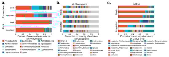 The microbial composition inside and outside the roots is critical for plant growth and development [,,]. Thirty days after inoculation, rhizosphere soil samples and cotton seedling root samples from each group were extracted to assess microbial communities based on 16S rDNA amplicon sequencing. Species richness and community diversity (alpha-diversity) both increased after inoculation, but were not significantly different (Table S3A,B).The species composition at the phylum level is shown in Figure 3a: after inoculation with RP01, Proteobacteria increased from 42.85 to 49.63% outside the root, but decreased from 95.02 to 81.44% inside the root; Bacteroidota decreased from 21.86 to 13.26% outside the root, but increased from 1.04 to 3.29% inside the root; and Actinobacteriota increased both inside and outside the roots. The top three dominant genera in the rhizosphere were WCHB1-32, Streptomyces, and Bradyrhizobium (Figure 3b), while in the roots they were unclassified_Rhodocyclaceae, Hydrogenophaga, and unclassified_Comamonadaceae (Figure 3c).