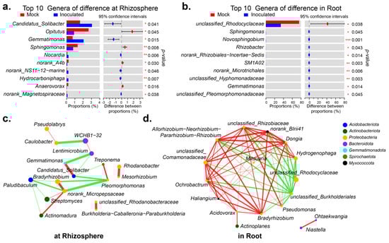 Important genera in rhizosphere and roots. The difference of top 10 genera when inoculated with B. paralicheniformis RP01 and without in rhizosphere (a) and in roots (b). Sorted by abundance. The species-related network reflected interactions between genera based on abundance, showing top 20 genera-to-genera correlations in rhizosphere (c) and in root. (d). The size of the nodes indicates the abundance of species, and different colors represent different phyla. The color of the connection line indicates positive and negative correlation, where red indicates positive correlation, and green indicates negative correlation. The thickness of the line indicates the size of the correlation coefficient; the thicker the line, the higher the correlation between species. The more lines, the closer the connection between that species and other species. *, p < 0.05; **, p < 0.01; ***, p < 0.001.