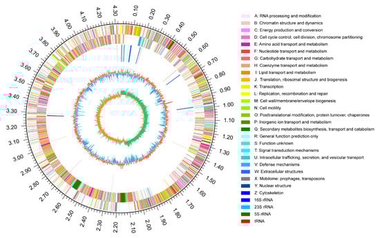 To further analyze the growth-promoting mechanism of RP01, we analyzed the RP01 genome in detail. RP01 contains only one chromosome with a total genome length of 4,338,611 bp and a GC content of 45.95%. The summarized results from the six major databases (NR, Swiss-Prot, Pfam, EggNOG, GO and KEGG) are listed in Table S5A,B. Finally, a closed-loop circle map was obtained using Circos analysis [] to fully characterize the genome (Figure 5).