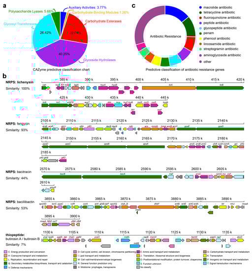 Metabolic system analysis of B. paralicheniformis RP01. (a) Carbohydrate-active enzyme prediction in RP01. (b) The secondary metabolite gene cluster prediction of RP01, and the colors of boxes based on the COG classification. (c) Drug resistance gene prediction in RP01 genome.