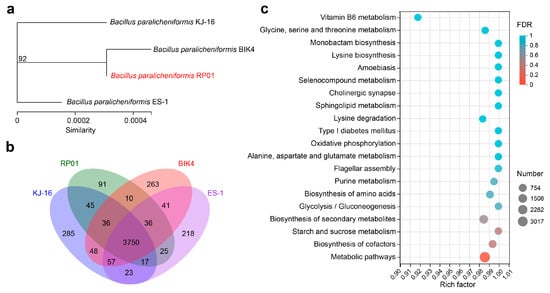 In addition, we selected three B. paralicheniformis strains with different functions for comparative genomic analysis with RP01. The basic annotation information is presented in Table 1. Among these, strain BIK4, which was isolated from the rice rhizosphere, could promote rice growth and inhibit pathogens []. KJ-16T was isolated from a soybean fermentation paste []. ES-1 was isolated from saline-sodic soil and showed salt tolerance and antibacterial activity against various pathogens []. From the phylogenetic tree of housekeeping genes, it was found that RP01 had the highest similarity with BIK4 (Figure 7a), and BIK4 happens to be the rhizosphere growth-promoting bacteria. Based on the Venn diagram (Figure 7b), we found that 3750 genes were shared by the 4 bacteria with KEGG functional enrichment, as shown in Figure 7c (Table S9A), and metabolic pathways were significantly enriched. RP01 was found to contain 91 unique genes, including the phosphatase RapE regulator, thioredoxin reductase, Fe-S cluster biogenesis protein NfuA and tellurite resistance membrane protein TerC (Table S9B).
