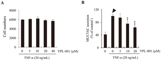 Inhibitory effect of YPL-001 on TNF-induced MUC5AC secretion in NCI-H292 cells. (A) No cytotoxicity of YPL-001 in NCI-H292 in the presence of TNF (20 ng/mL). (B) Suppressive effect of YPL-001 on the secretion of MUC5AC protein (arrowhead) from TNF-stimulated NCI-H292. ** p < 0.01 and *** p < 0.001 compared to the TNF alone.
