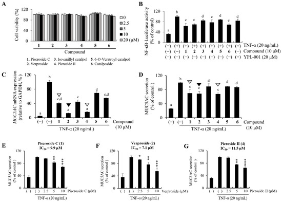 Inhibitory effects of the six iridoids in YPL-001 on TNF/NF-κB-induced MUC5AC expression in NCI-H292. (A) No cytotoxicity of six iridoids in NCI-H292. (B) Luciferase-based reporter assay tested under the control of NF-κB-responsive elements containing minimal promoter. (C,D) Suppressive effects of each iridoid (1–6) on TNF-induced MUC5AC production. MUC5AC mRNA transcription and protein secretion were assayed using qPCR and ELISA, respectively. NCI-H292 were pre-treated with 10 µM of each iridoid for 2 h and then treated with TNF (20 ng/mL) for an additional 12 h to carry out qPCR or for an additional 24 h to carry out ELISA. The three iridoids have strong suppressive effects on TNF-induced MUC5AC expression (piscroside C in grey, verproside in black, and picroside II in white arrowhead). Two-way ANOVA with Tukey’s multiple comparisons test was performed (B–D). a–d Different superscript letters on the bar graph mean significant statistical differences (p < 0.05). There is no statistical significance between groups sharing the same letter. (E–G) The half-maximal inhibitory concentration (IC50) of iridoids 1 (piscroside C), 2 (verproside), or 4 (picroside II) on MUC5AC secretion. * p < 0.05, ** p < 0.01, and *** p < 0.001, as compared to the TNF alone.