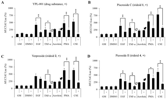 Inhibitory effects of YPL-001 and its three iridoids on various stimuli for mucus overproduction. Inhibitory effects of YPL-001 (A), piscroside C (B), verproside (C), and picroside II (D) on various stimuli for MUC5AC production were assayed in HEK293T cells expressing a luciferase reporter gene fused to the MUC5AC promoter (MUC5AC promoter-Luc). The cells were pre-treated for 2 h with the indicated concentrations of YPL-001 (20 µM) or the three iridoids (10 µM), followed by treatment with EGF (100 ng/mL), TNF (20 ng/mL), acrolein (30 nM), PMA (100 nM), or CSE (10 µg/mL) for another 16 h. Luciferase activity was significantly reduced by YPL-001, iridoids 1 (piscroside C), 2 (verproside), and 4 (picroside II) in TNF-stimulated cells (white arrows). YPL-001 and its iridoids had no suppressive effect on acrolein-induced inflammation (black arrows). * p < 0.05, ** p < 0.01, and *** p < 0.001, as compared to each stimulus alone. CSE, cigarette smoke extract.