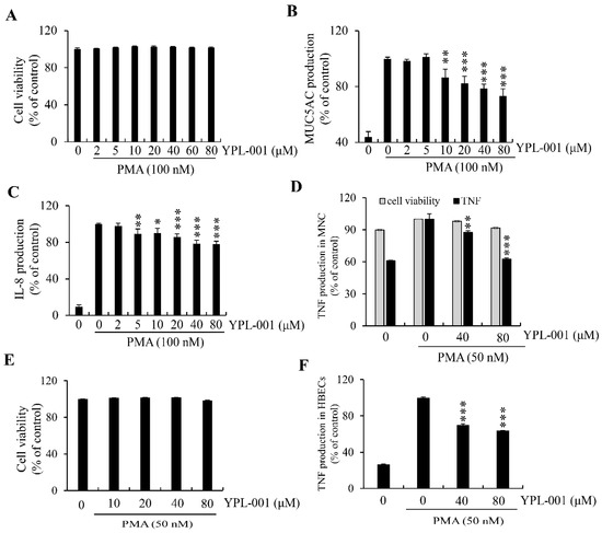 Inhibitory effect of YPL-001 on PMA-induced MUC5AC, IL-8, or TNF secretion in NCI-H292, human mononuclear cells(MNCs), or primary human bronchial epithelial cells (HBECs). (A) No cytotoxicity in NCI-H292 treated with YPL-001 at concentrations below 80 μM in the presence of PMA (100 nM). PMA was used to activate PKC. (B,C) The effect of YPL-001 on PMA-induced secretion of MUC5AC or IL-8 protein was assayed using ELISA. (D) Cell viability and TNF secretion by YPL-001 on PMA (50 nM)-stimulated human MNCs isolated from umbilical cord blood (UCB) are measured by CCK-8 and ELISA, respectively. (E,F) Cell viability and TNF secretion by YPL-001 on PMA (50 nM)-exposed human HBECs are measured by CCK-8 and TNF ELISA, respectively. * p < 0.05, ** p < 0.01, and *** p < 0.001, as compared to the PMA alone.
