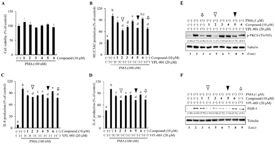 Inhibitory effects of YPL-001 and its six iridoids on PMA/PKCδ/EGR-1-induced inflammation in NCI-H292. (A) No cytotoxicity in NCI-H292, treated with the six iridoids in the presence of PMA. (B–D) YPL-001 or each iridoid suppresses the PMA-induced secretion of MUC5AC, IL-8, and IL-6 proteins. The inhibitory effects of iridoids 2 (white arrowheads) and 5 (black arrowheads) are comparable to that of YPL-001 (white arrow). Two-way ANOVA with Tukey’s multiple comparisons test was performed (B–D). a–e Different superscript letters on the bar graph mean significant statistical differences (p < 0.05). There is no statistical significance between groups sharing the same letter. (E,F) The inhibitory effect of iridoids 2 (verproside) and 5 (6-O-veratroyl catalpol) on PKCδ phospho-activation (E) and its downstream-target EGR-1 expression (F). The PKCδ phospho-activation level and EGR-1 expression were assayed using western blotting. Tubulin is a loading control. The relative intensity (a fold of control) from two independent experiments is shown below the band.