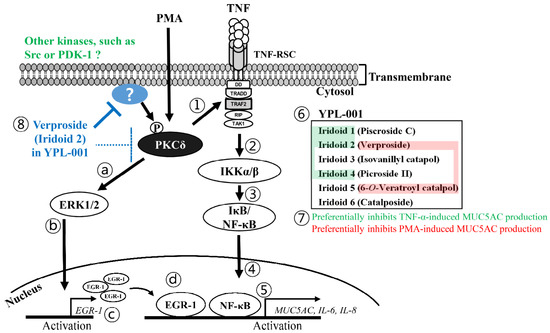 The proposed role of verproside in airway inflammation. In human airway cells, PKCδ elicits the expression of inflammatory genes, such as MUC5AC, IL-6, and IL-8, by regulating two pathways: TNF-induced NF-κB signaling (steps 1–5) and PMA-induced PKCδ/EGR-1 signaling (steps a-d). (Step 1) Activated PKCδ promotes TNF-RSC formation by binding to TRAF2 subunits [5]. (Steps 2–4) Subsequently, TNF-RSC activates IκB kinase (IKK), thereby inducing the nuclear translocation of cytosolic NF-κB by inhibiting IκB activity. (Step 5) Nuclear NF-κB binds to the promoter regions of its target genes to induce MUC5AC overexpression or cytokine release. (Steps a–c) At the same time, activated PKCδ also upregulates EGR-1 expression via ERK1/2. (Step d) EGR-1 cooperates with nuclear NF-κB to upregulate mucin overexpression and cytokine release. (Steps 6–7) YPL-001 efficiently suppressed TNF-induced NF-κB and PMA-induced PKCδ/EGR-1 signaling. Among the six iridoids in YPL-001, iridoids 1, 2, and 4 preferentially inhibited the TNF-induced NF-κB pathway (shaded green). In contrast, iridoids 2 and 5 preferentially inhibited PMA/EGR-1-induced inflammation (shaded red). (Step 8) Iridoid 2 efficiently suppresses both NF-κB and EGR-1 activity by inhibiting PKCδ activation. Verproside binds to PKCδ but weakly inhibits the kinase activity (a broken line) compared to its inhibitory effect in NCI-H292 cells or in vivo. Thus, we suppose that verproside may inhibit more upstream components that regulate PKCδ phosphorylation.