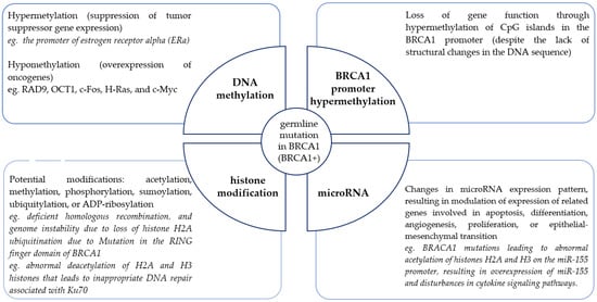 In addition to the study of germline genetic changes, epigenetic changes affecting the modulation of predisposition gene expression, as well as causing disturbances in signaling pathways, especially those related to DNA repair, are being increasingly studied. Epigenetics is a critical mechanism for regulating transcription [54,55]. Epigenetic information is encoded in the structure and function of covalent modifications of DNA (hypomethylation or hypermethylation) and DNA-related nuclear chromatin histone proteins (such as acetylation, methylation, phosphorylation, sumoylation, ubiquitylation, or ADP-ribosylation). In the last few years, attention has been increasingly paid to the role of microRNAs as diverse expression regulators with high therapeutic potential. Epimutations can lead to the silencing of tumor suppressor genes independently and also in combination with pathogenic genetic mutations. Epimutations can also promote tumorigenesis by activating oncogenes. The events that lead to the onset of these epigenetic abnormalities are still not fully understood. Nevertheless, because epigenetic changes are inherited, they are selected in the rapidly growing population of cancer cells and provide a growth advantage for cancer cells, promoting their uncontrolled growth. For many genes of high predisposition, typical epigenetic changes have been determined, which affect the abnormal function of these genes and are one of the causes of cell transformation. Individual epimutations may act independently or together. As in the case of the BRCA1 gene (Figure 1), they can be differentiated and involve different mechanisms. BRCA1 alters epigenetics through physical interactions and transcriptional regulation of known epigenetic modifiers. In addition, as an E3 ubiquitin ligase, BRCA1 directly ubiquitylates histones.