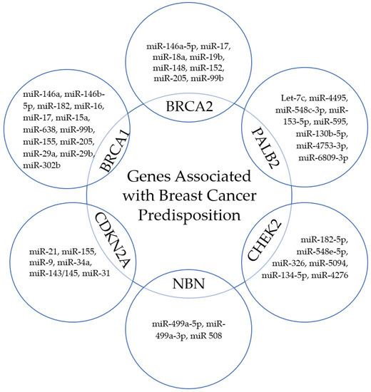 miRNA expression pattern is associated with oncogenesis. MiRNAs are a special class of small (18–26 nucleotides), evolutionarily conserved non-coding RNA molecules, which, through post-transcriptional regulation of gene expression, affect the proper development and maintenance of tissue homeostasis, as well as being involved in the development of pathological processes [143,144,145]. They are thought to be responsible for regulating close to 30% of human mRNAs; one miRNA can regulate multiple target sequences, and one gene can be controlled by numerous microRNAs. In recent years, they have gained popularity as non-invasive biomarkers for assessing tumor development, as their significant role in carcinogenesis, cancer progression, cell cycle checkpoint bypass, drug response regulation, and invasion has been described [146,147,148,149,150,151] (Figure 2). It has been shown that miRNAs act as both oncogenes and tumor suppressor genes, which gives them a wide range of modulation processes in cancer cells [152,153,154]. Numerous studies have identified miRs associated with abnormal expression and function of breast cancer predisposition genes (Figure 3).