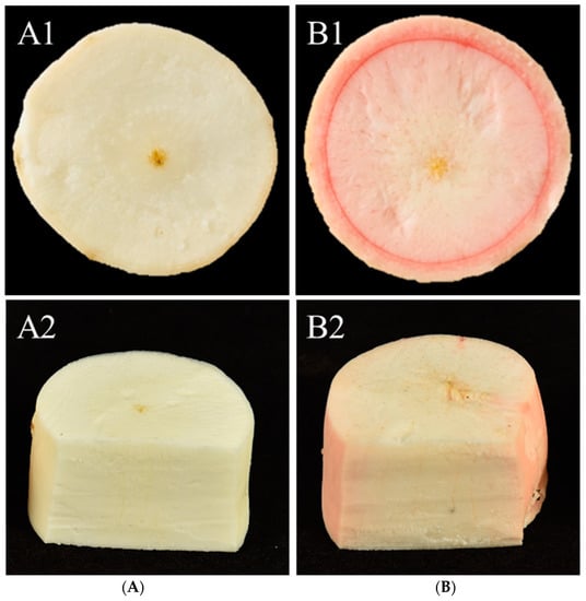Phenotypes of SC and PC. (A) The white flesh of cassava storage roots; (B) The pink flesh of cassava storage roots. SC: M. esculenta Crantz cv. sugar cassava GPMS0991L; PC: M. esculenta Crantz cv. pink cassava BRA117315. (A1,B1) shows the of transverse section SC and PC, (A2,B2) shows the longitudinal section of SC and PC.