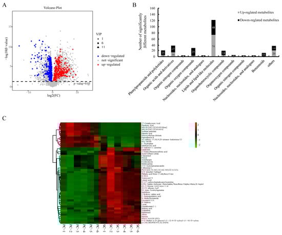 Significantly changed metabolites (SCMs) in PC compared to those in SC. (A) Volcano plot of the metabolites between SC and PC. (B) The number of SCMs in each category. (C) Heatmap of 299 SCMs. SC: M. esculenta Crantz cv. sugar cassava GPMS0991L; PC: M. esculenta Crantz cv. pink cassava BRA117315.