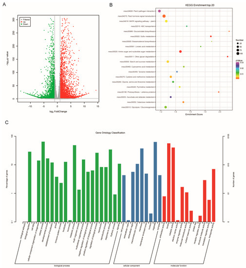 Screening and functional enrichment analysis of DEGs. (A) The overall distribution of gene expression levels and fold differences between SC and PC. (B) KEGG pathway enrichment of DEGs. (C) Gene ontology classification of DEGs. SC: M. esculenta Crantz cv. sugar cassava GPMS0991L; PC: M. esculenta Crantz cv. pink cassava BRA117315.