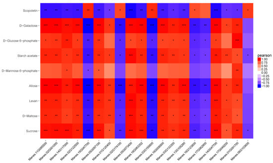 Correlation heatmap of SCMs and DEGs in sucrose and starch metabolism between SC and PC in cassava. Colored in “red” and “blue” indicated positive and negative correlations, respectively. SC: M. esculenta Crantz cv. sugar cassava GPMS0991L; PC: M. esculenta Crantz cv. pink cassava BRA117315. Correlation differences are indicated by asterisk (* p < 0.5, ** p < 0.01, *** p < 0.001).