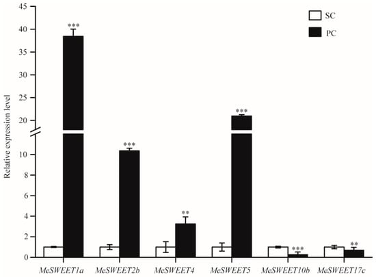 The expression profile of six SWEETs were found in PC compared to SC, four SWEETs (MeSWEET1a, MeSWEET2b, MeSWEET4 and MeSWEET5) were up-regulated, and two SWEETs (MeSWEET10b and MeSWEET17c) were down-regulated. The qRT-PCR results confirmed the transcriptomic data and showed that the expression levels of MeSWEET1a and MeSWEET5 were significantly higher in PC (Figure 5).
